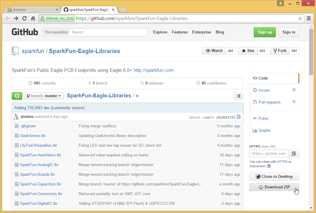 The First thing we need to learn is, how to install a third party library. You can create your own library but that is another story and we will deal with that in another tutorial. So In this tutorial we will install the SparkFun's Eagle Library, which also have Arduino328P. Go to here and click on the "Download Zip" button on the right side.