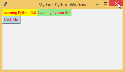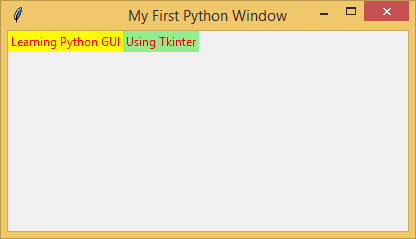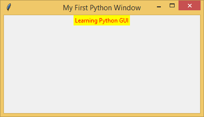 myFirstGui = Tk() myFirstGui.geometry('400x200+200+100') myFirstGui.title('My First Python Window') myLabel01 = Label(myFirstGui, text = 'Learning Python GUI', fg = 'red', bg = 'yellow').pack() myFirstGui.mainloop()