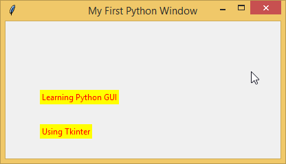 myFirstGui = Tk() myFirstGui.geometry('400x200+200+100') myFirstGui.title('My First Python Window') myLabel01 = Label(myFirstGui, text = 'Learning Python GUI', fg = 'red', bg = 'yellow').place(x = 50, y = 100)