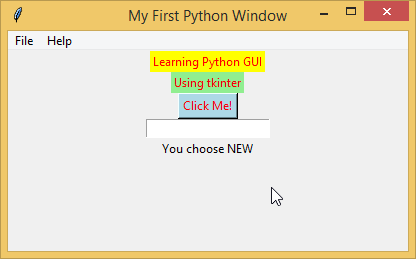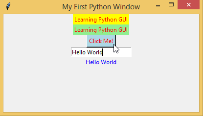myEntry = StringVar() myFirstGui.geometry('400x200+200+100') myFirstGui.title('My First Python Window') myLabel01 = Label(myFirstGui, text = 'Learning Python GUI', fg = 'red', bg = 'yellow').pack()