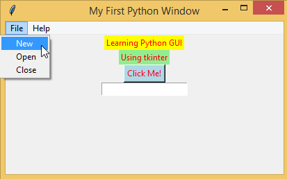 # START menu block myMenuBar = Menu (myFirstGui)