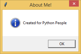 messagebox.showinfo(title = 'About Me!', message = 'Created for Python People')