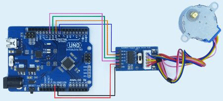 The Stepper motor needs a module which is basically a motor driver. The following diagram shows the wiring using a UNO board